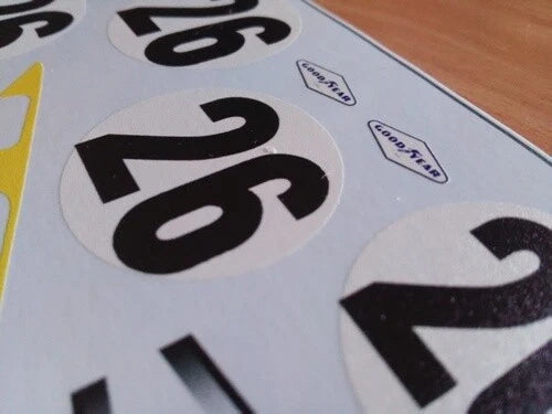 L'impression fait appel à la plus récente technologie, et utilise une encre blanche sur un film transfert transparent. Ces décalcomanies n'ont pas été produites à l'aide d'une imprimante à jet d'encre, d'une imprimante laser ou d'une imprimante Alps ! Les encres utilisées résistent aux éraflures, et les décalcomanies sont prêtes à l'utilisation, sans avoir besoin d'une quelconque couche de vernis. Un papier à fond bleu spécifique est utilisé. Ces décalcomanies ne sont pas pré-découpées, et doivent donc être détourées avant utilisation.