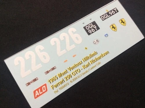 1965 MONT VENTOUX HILLCLIMB #226 FERRARI 250 GTO KARL RICHARDSON 1:43, 1:24, 1:18 DECALS