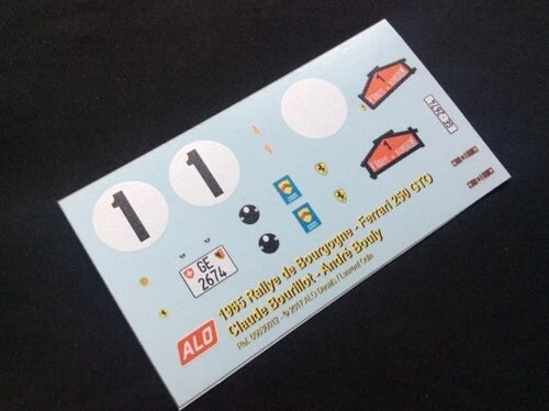 1965 BOURGOGNE RALLY #1 FERRARI 250 GTO CLAUDE BOURILLOT/ANDRE BOULY 1:43, 1:24, 1:18 DECALS