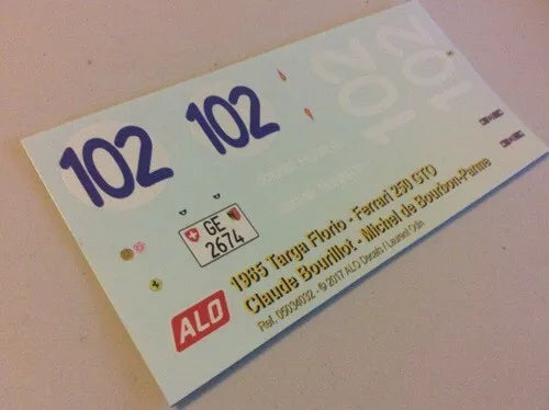 1965 TARGA FLORIO #102 FERRARI 250 GTO CLAUDE BOURILLOT/MICHEL DE BOURBON-PARME 1:43, 1:24, 1:18 DECALS