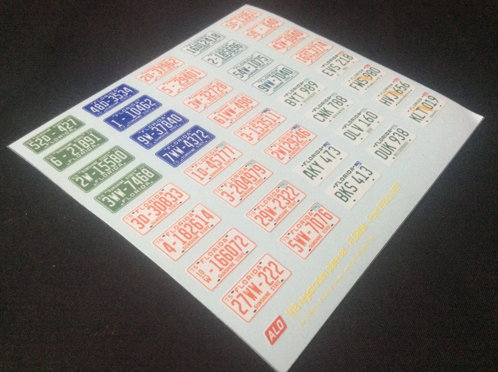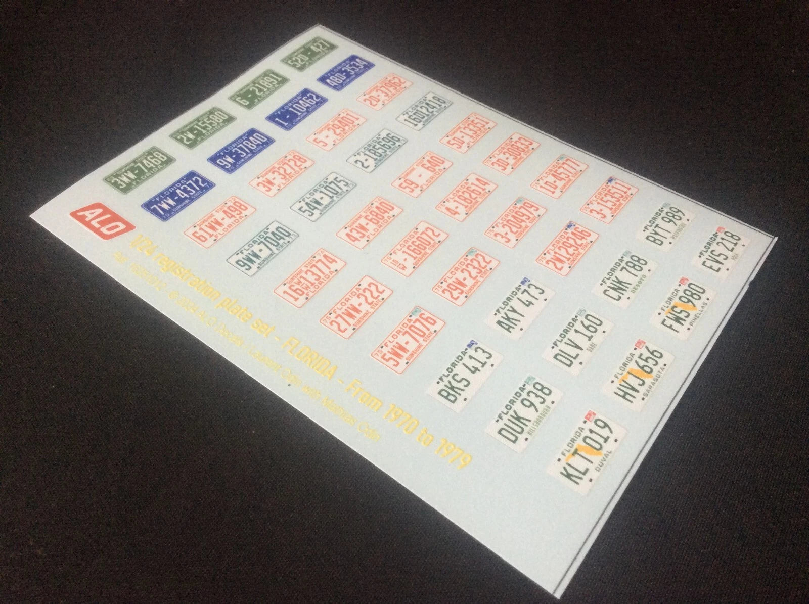 1970-1979 FLORIDA REGISTRATION PLATES 1:43, 1:24, 1:18 DECALS - FOR 40 CARS