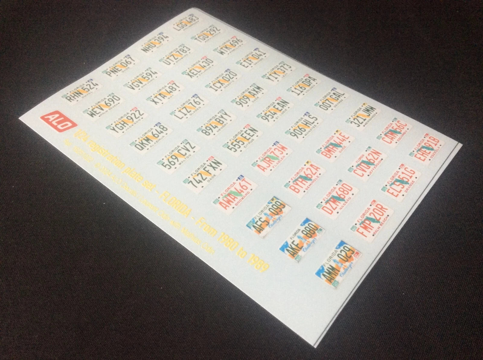 1980-1989 FLORIDA REGISTRATION PLATES 1:43, 1:24, 1:18 DECALS - FOR 40 CARS