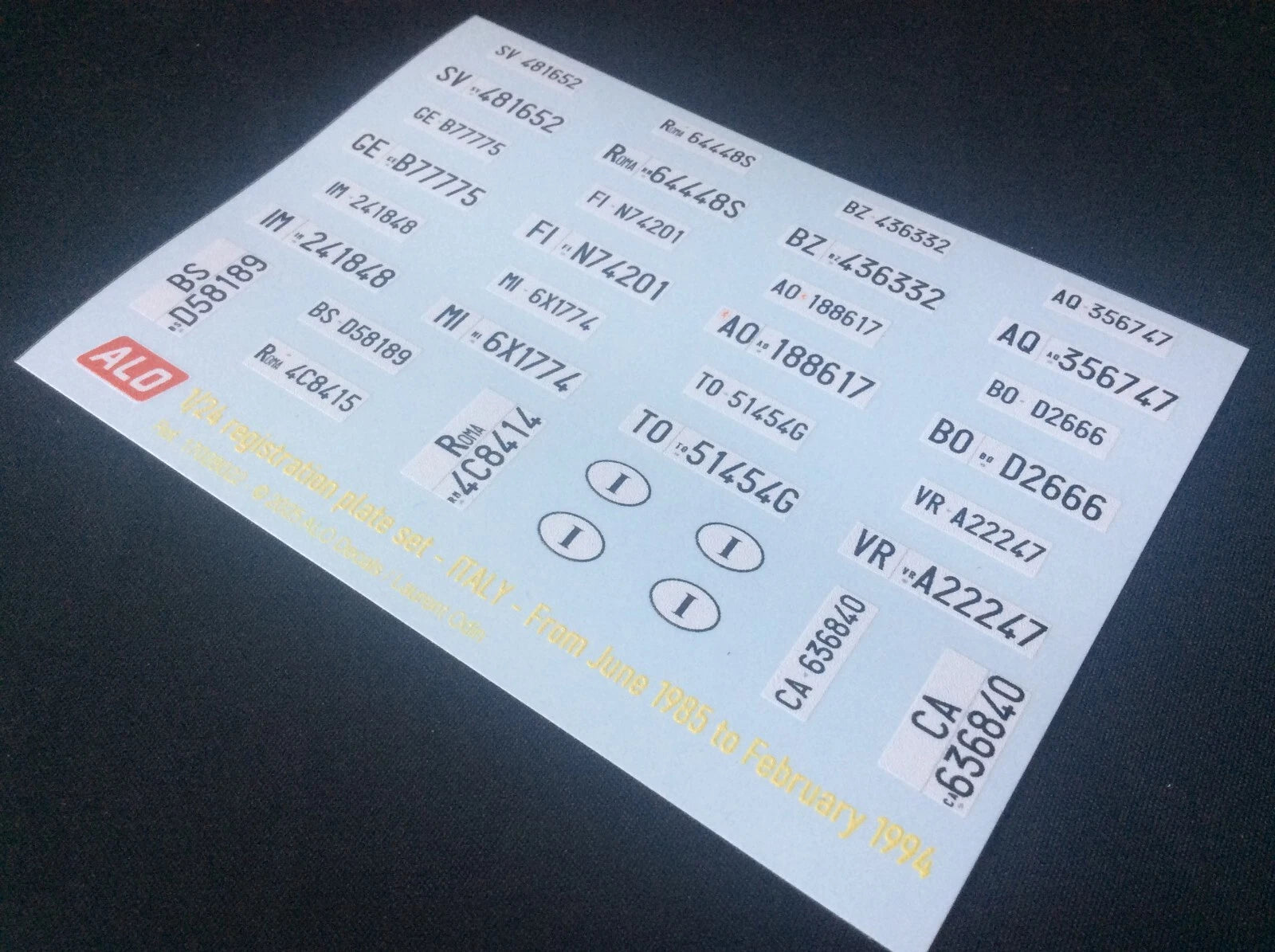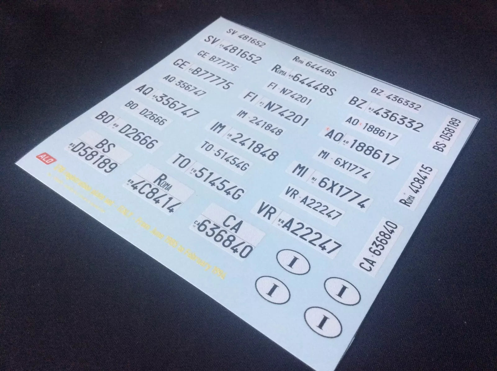 1985-1994 ITALIAN REGISTRATION PLATES 1:87, 1:43, 1:24, 1:18 DECALS - FOR 15 CARS
