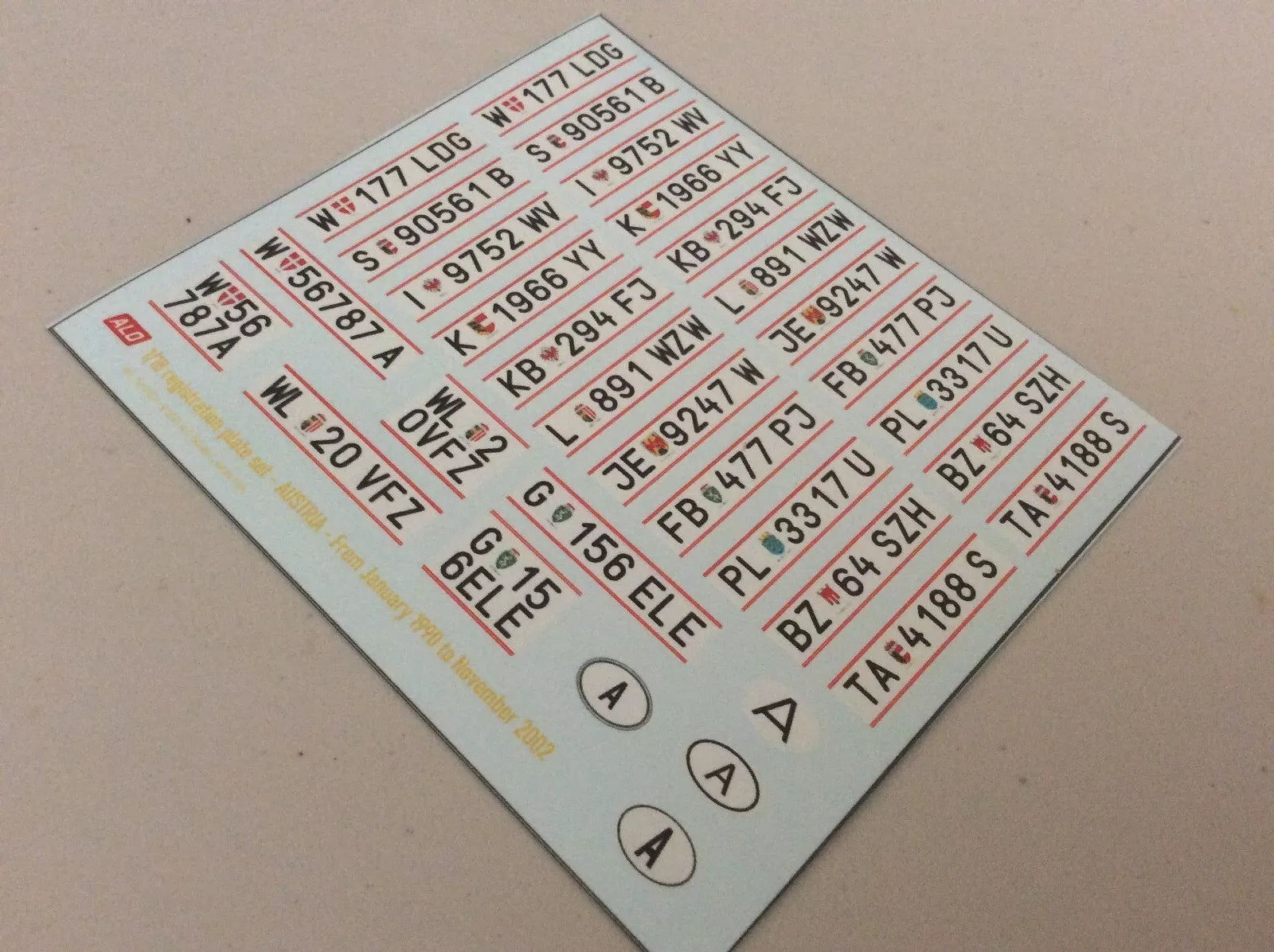 1990-2002 AUSTRIAN REGISTRATION PLATES 1:43, 1:18 DECALS - FOR 14 CARS